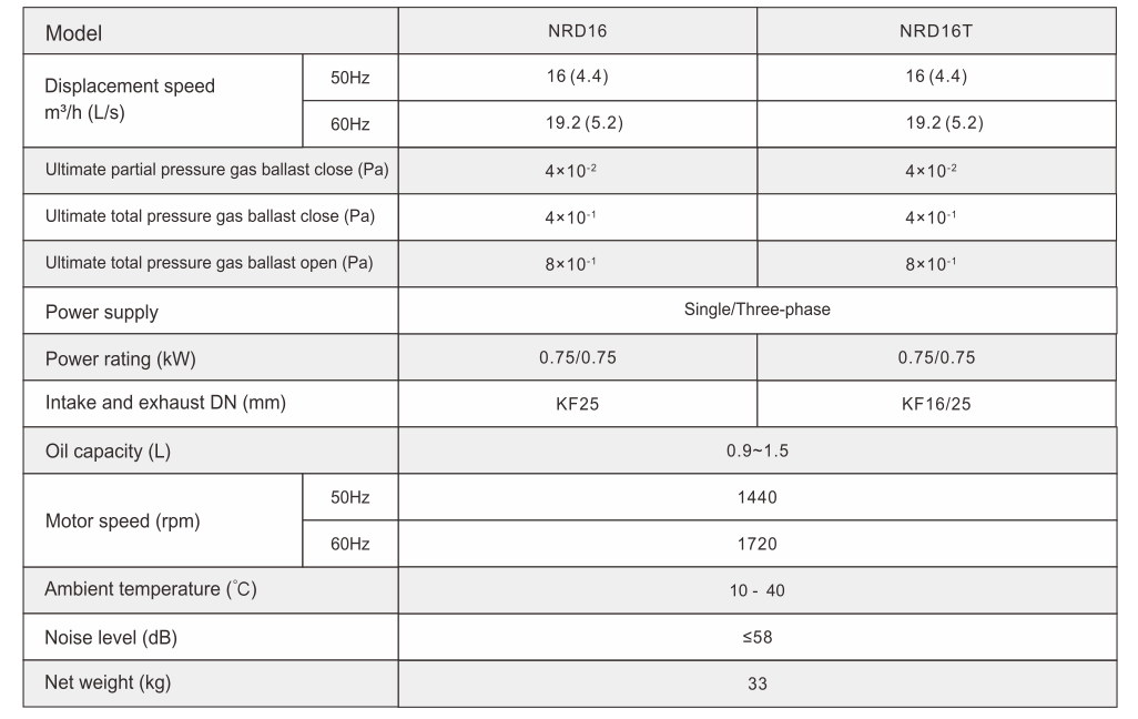 With ultimate vacuum down to 3 microns and industrial grade design, NAVAC NRD16T is perfect for heavy-duty jobs, with its high speed and maximum durability. Featuring cUL approval, two shift adjustable gas ballast valve, anti-suck back design and a forced oil circulation system, the NRD16T is your ideal vacuum pump.