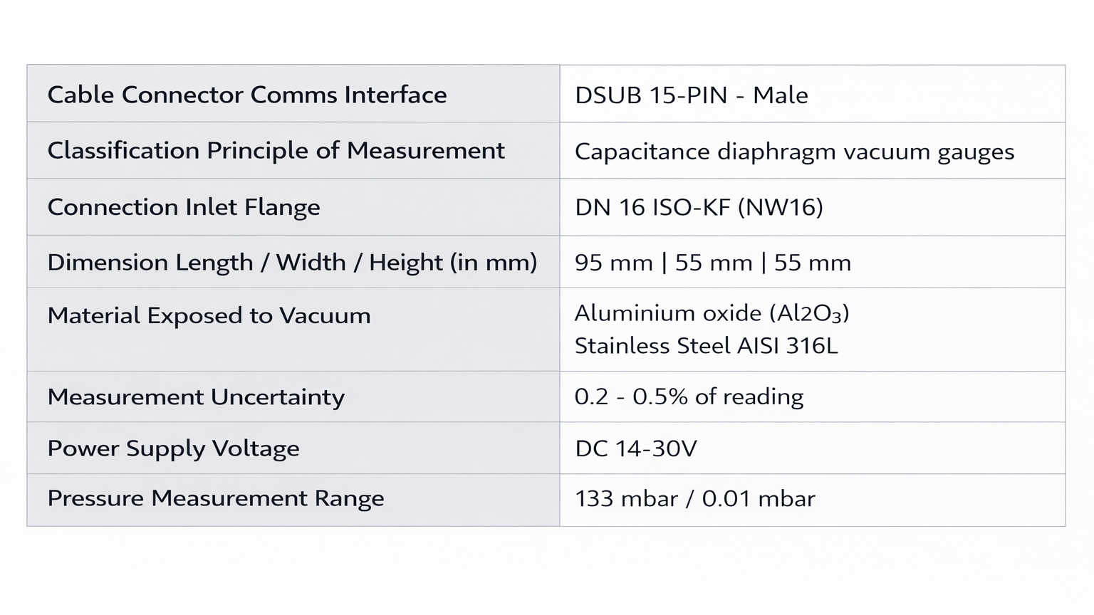 - Measurement/display range: from 1000 Torr to 10-5, depending on the model